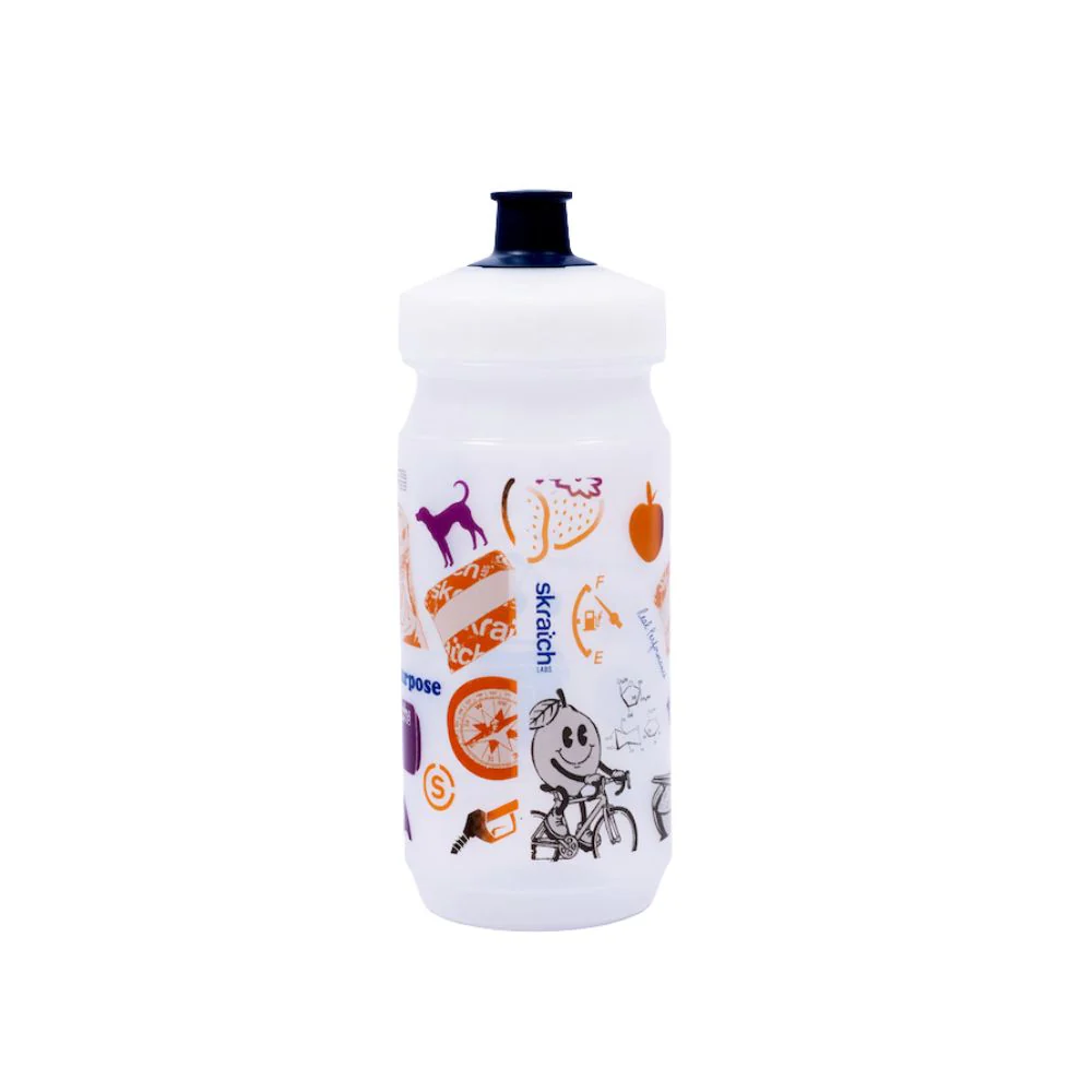It squeezes easy, flows fast, and doesn’t fight you when you’re trying to grab a sip mid-climb. Exactly how a bike bottle needs to be. Wrapped in a playful collage of Skratch icons from espresso makers to heart rate graphs, it’s basically a tiny tribute to the things that power a good day.
